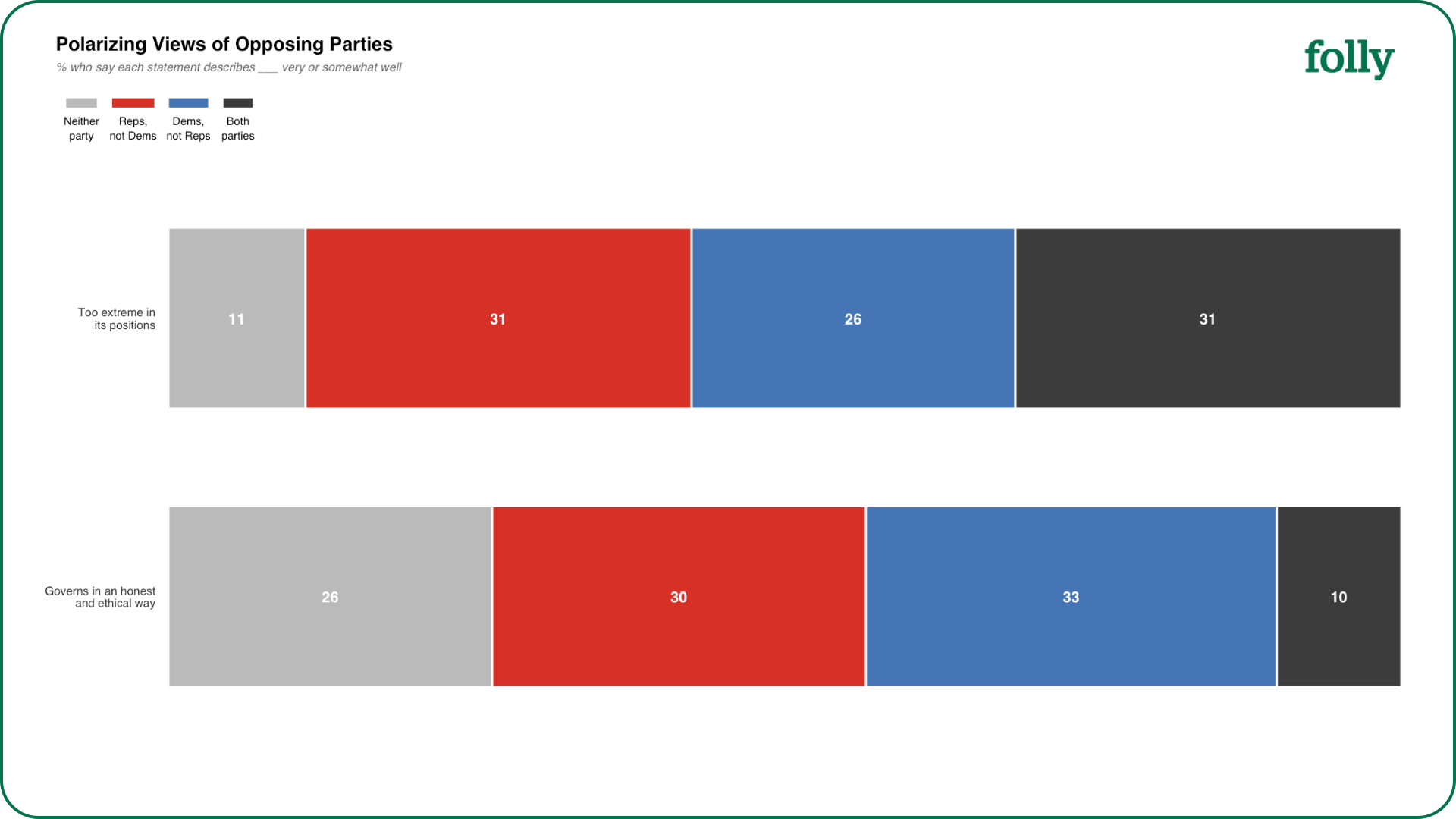 This isn't isolated to the University of Hohenheim study. In fact, a poll by Pew Research Center found that among Americans surveyed, twenty-six percent found Democrats only to be too extreme in their policies, a third found Republicans only to be too extreme, and another third found both parties to be too extreme. Furthermore, a third believed only Democrats govern in an honest and ethical way, while another third believed that to be true only of conservatives. There is a growing and significant portion of each party that thinks the other is completely corrupted, extreme, and close-minded.