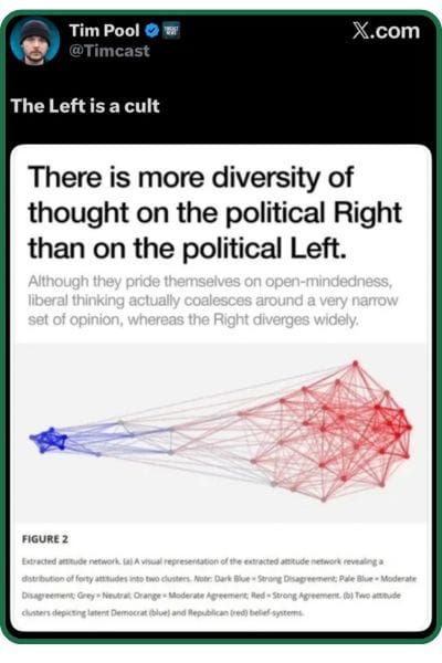 However, if you've been on social media recently, you may have seen a variation of a figure floating around that seems to insinuate that. Below is one such example: a network of nodes where the "blue" ones are tightly bound together while the "red" ones are much more spread out. This is typically followed by minimal context and a dramatized caption about how those on the left are close-minded and have a narrow set of extreme attitudes despite the openness they preach. This particular version was shared by conservative political commentator Tim Pool and viewed 2.1 million times.