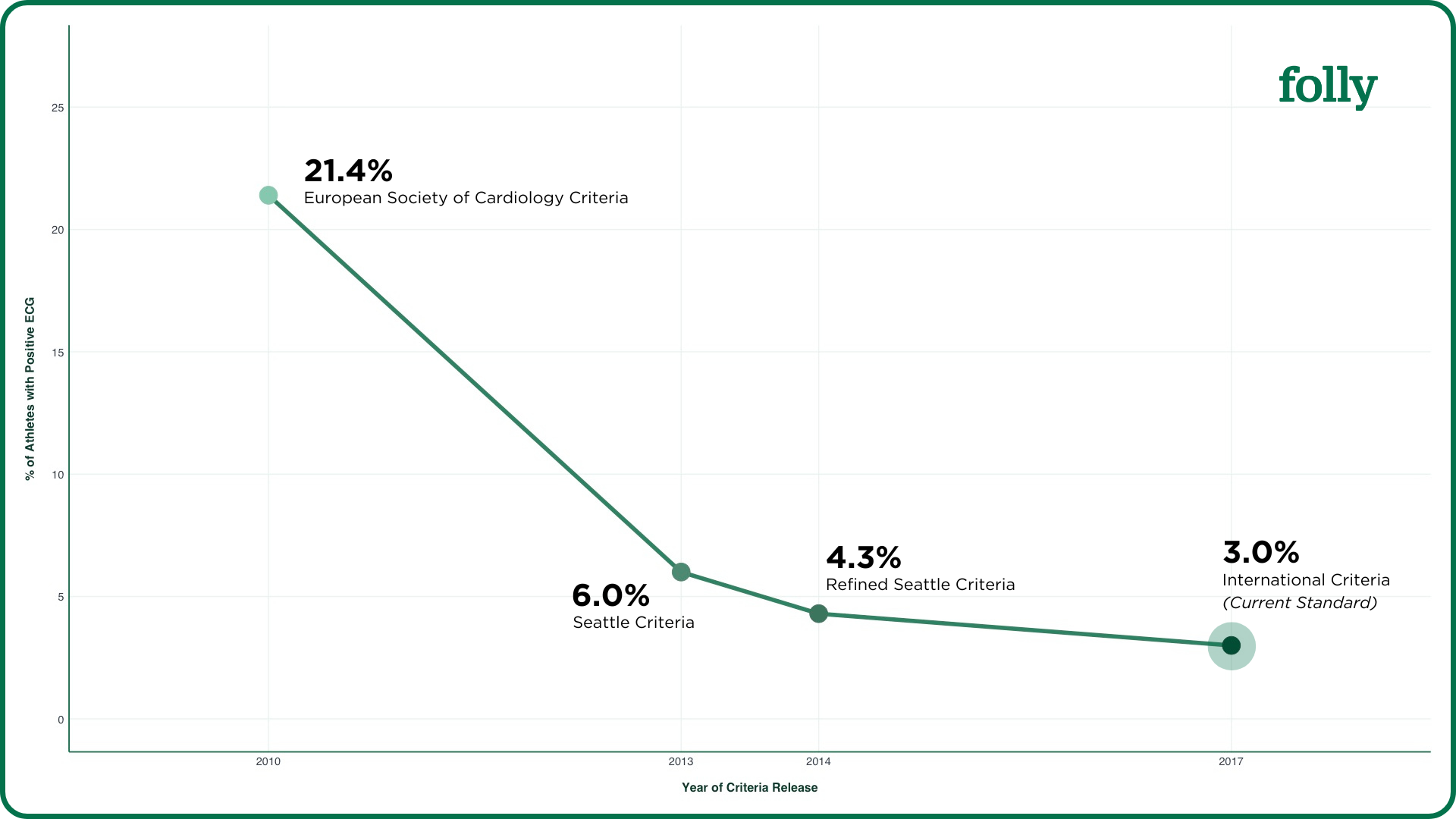 The figure above demonstrates this. It presents data from a retrospective study comparing different EKG interpretation criteria for athletes over time. The authors applied various criteria to the same dataset to determine the percentage of cases that would be flagged as positive and require follow-up. The trend shows substantial improvement in specificity with each successive iteration, with the latest criteria demonstrating over a 17% reduction in cases warranting follow-up care when compared to what was used a decade ago.